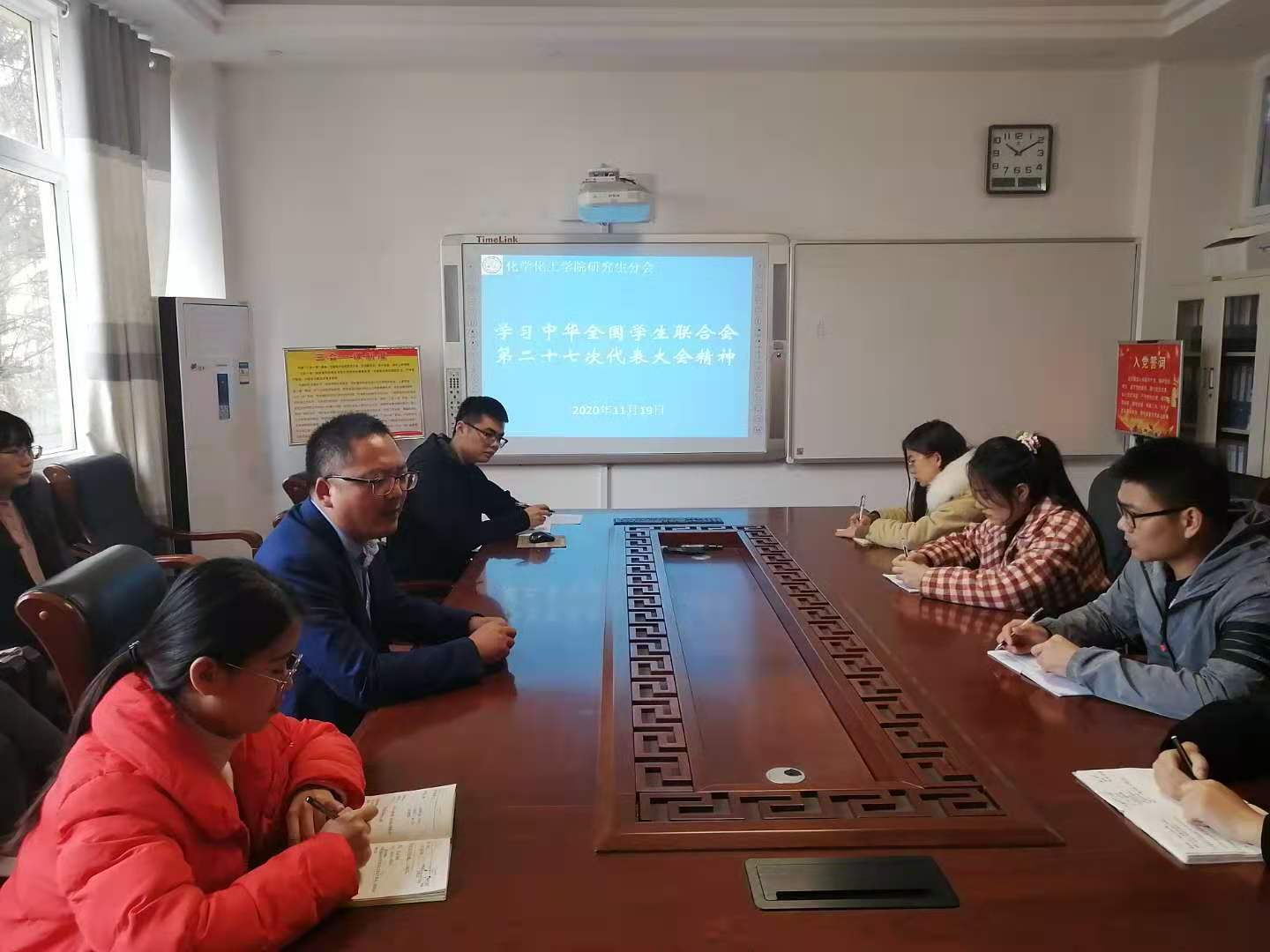 为深入贯彻落实习近平总书记关于青年工作的重要思想、进一步深化高校学生会及研究生会改革、支持和引导学生会更好地服务青年学生成长成才,11月19日,永利集团304am登录研究生在实验楼313会议室召开了学习中华学生联合会第二十七次代表大会精神为主题的会议,研究生党支部书记、班主任曹俊涛老师出席会议,本院研究生分会主席团成员及各部门工作人员参加会议。