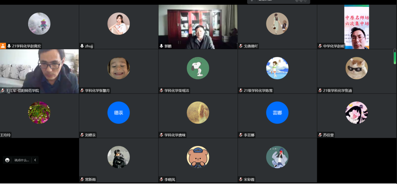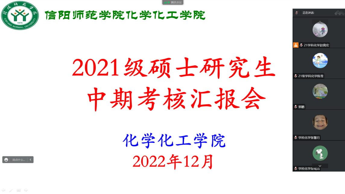 根据学校《关于做好2022-2023学年第一学期末研究生培养工作的通知》与《信阳师范学院硕士研究生培养工作暂行规定》的总体安排,12月13日,永利集团304am登录通过腾讯会议在线上举行2023届毕业教育硕士研究生中期考核汇报。考核组专家由刘德汞、郭鹏、王红军、朱建君、王玲玲、赵明等老师组成,汇告会由郭鹏主持。该专业全体研究生参会观摩学习。