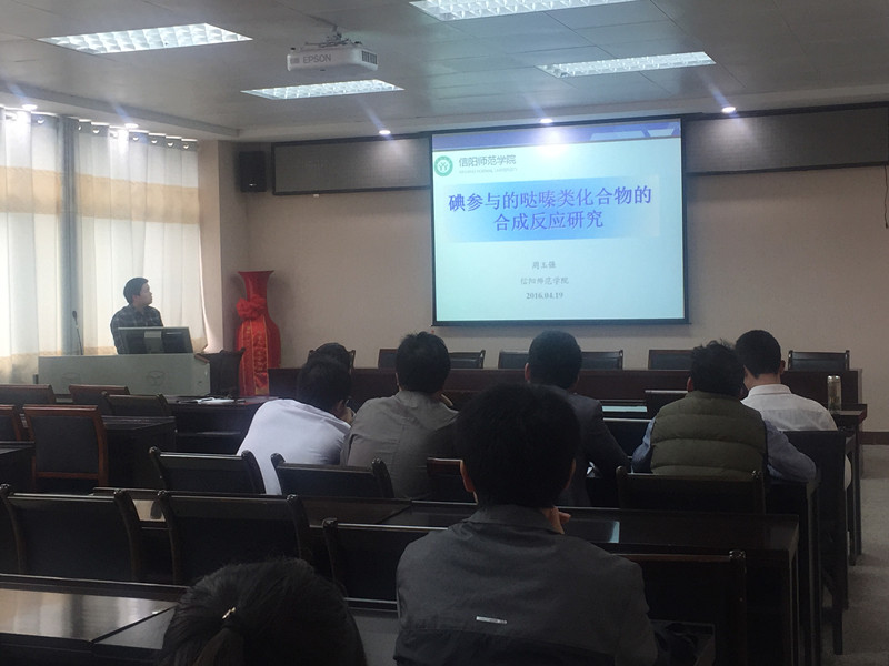 报告开始之前,黄克靖教授介绍了活动的开展情况。随后,赵祥华博士、周玉强博士和陈明博士分别做了“位阻型芴基发光材料的设计合成及其应用”、“碘参与的哒嗪类化合物的合成反应研究”和“亲水、磁性Fe3O4/C纳米复合物的一步法水热合成及其在去除有毒化学品中的应用”学术报告。