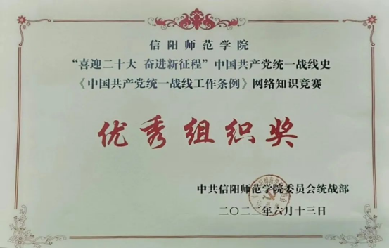 为深入学习宣传贯彻习近平新时代中国特色社会主义思想、习近平总书记关于加强和改进统一战线工作的重要思想,引导和调动全体师生在浓厚党史、统战史学习氛围中迎接党的二十大胜利召开。省委统战部、校党委统战部认真部署、精心组织,5月12日至31日,动员师生积极参加了“喜迎二十大 奋进新征程”中国共产党统一战线史和《中国共产党统一战线工作条例》网络知识竞赛。校党委统战部荣获优秀组织奖,受到省委统战部通报表彰。