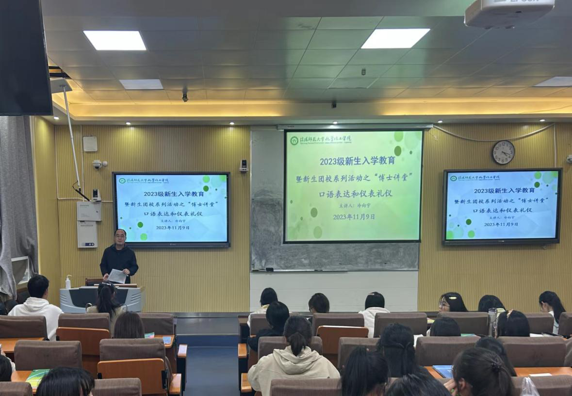 冷向宇以“口语表达和仪表礼仪”为题,通过例举著名主持人杨澜大学期间成功面试某档综艺从而迈出成功第一步的故事,告诉同学们在大学生活中要做到:一保持良好的身体素质;二加强知识、能力和技能的储备;三培养良好的职业意识做好对于挫折的心理准备;五具备一定的人文素养。他告诫同学们大学四年要通过注意以上个方面能力的培养来提升个人综合素,从而顺利迈出人生路上成功的第一步。冷向宇通过讲解规范着装引导同学们要注意个人礼仪,严格遵守“敬人、宽容、适度、真诚”原则;关注个人仪容仪表,做到自然美、修饰美、内在美,遵照“美观、整洁、卫生、得体”的基本规则,学会在特定场合中以特定形象示人,达到大方宜礼的外在效果。