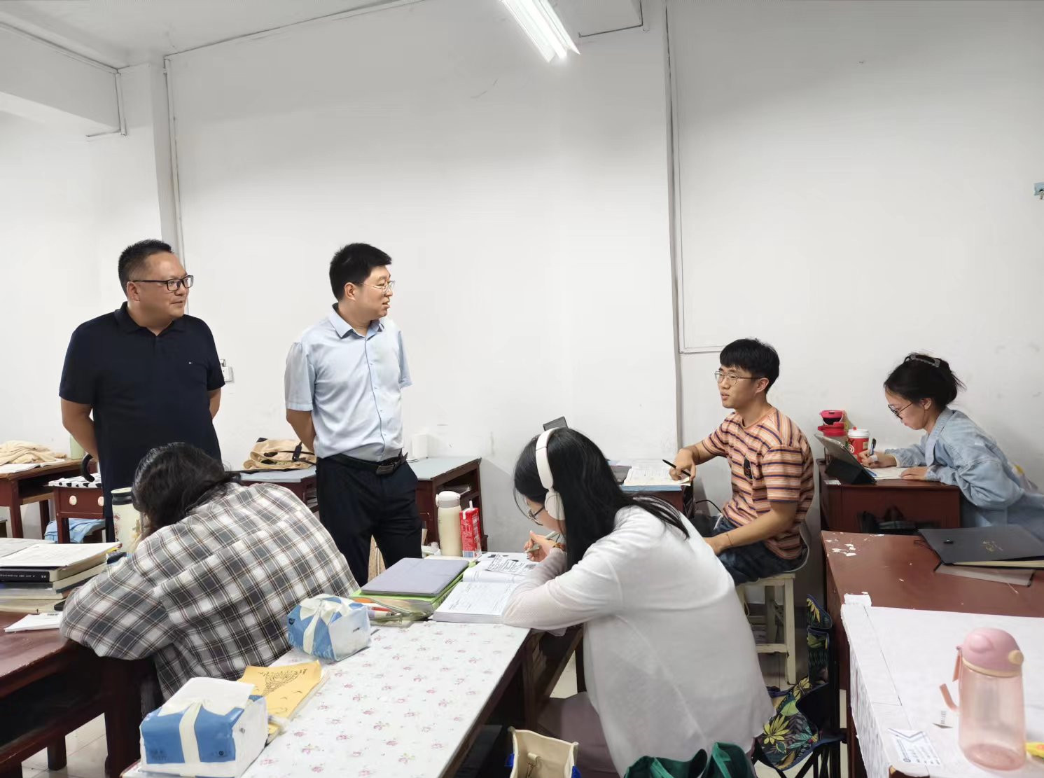 7月9日,永利集团304am登录党委书记吴志伟,院长曹俊涛、2021级班主任前往教五楼考研自习室,看望慰问永利集团官网留校考研学生,为他们送上关怀与祝福。