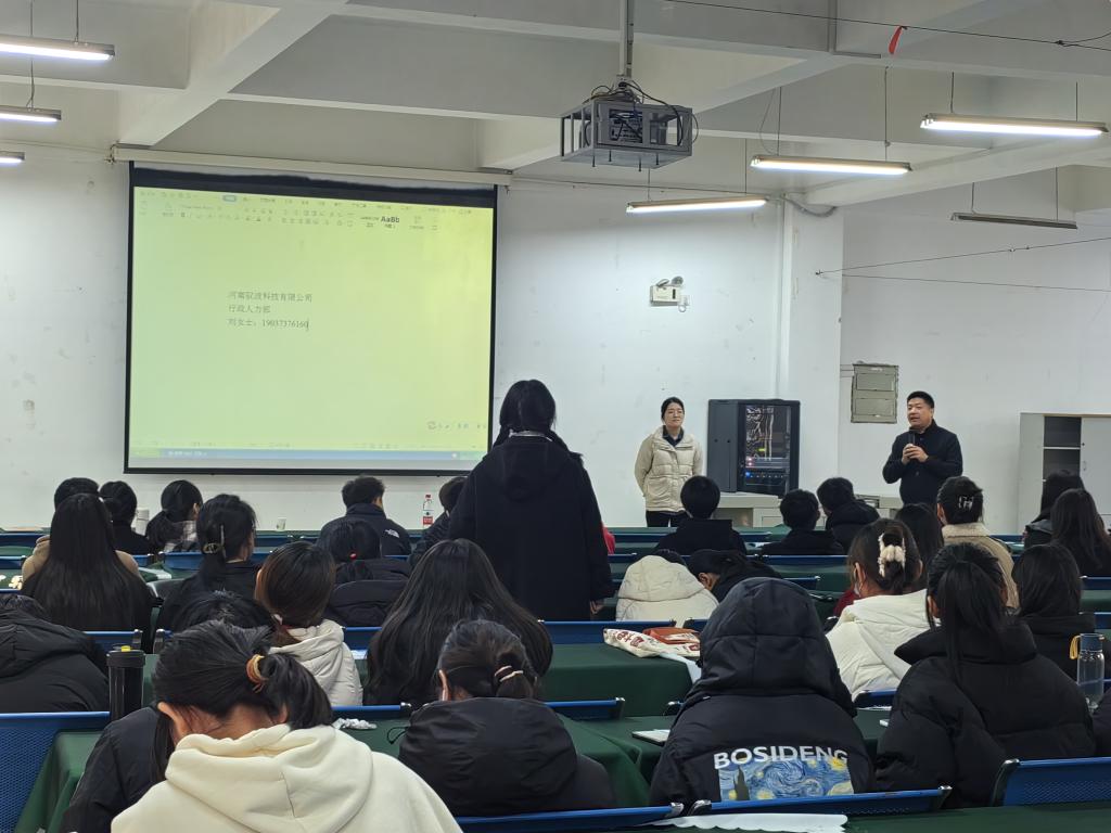 首先,甄西合结合自身求学、就业、创业丰富经历,为同学们讲解了化学学科发展的相关知识前沿、就业创业前景,强调了化学学科的重要性及社会经济发展需求和相关专业人才的缺乏。而后,他从主营业务、技术覆盖、企业资质、科研条件、科研合作、研发投入、创新成果、成果转化、发展规划、人才需求等多个角度,详细介绍了企业的发展情况并重点说明人才招聘计划。接着,驭波集团子公司河南微米光学科技总经理张树树,对企业人才培养方面进行介绍,她指出科技人员不仅要有技术基础,还要能“听得到炮火”,做到积极与客户进行沟通,善于了解并解决顾客诉求。她鼓励员工自主成长,强调扁平化管理更利于发展人才。同时,她告诉各位求职的毕业生:“阻碍我们攀登的不是远处的群山,而是你鞋里的一粒沙,眼里的一粒沙,心里的一粒沙。”旨在勉励同学们应以良好心态与积极态度对待生活中各种问题。接着,我校入职驭波集团的2023届毕业生进行分享,结合自身的大学生活和入职经历,提出在校大学生应早日找到自己的未来发展方向。最后,甄西合对就同学们提出的问题进行详细解答,并强烈表达了对人才的招揽期望。