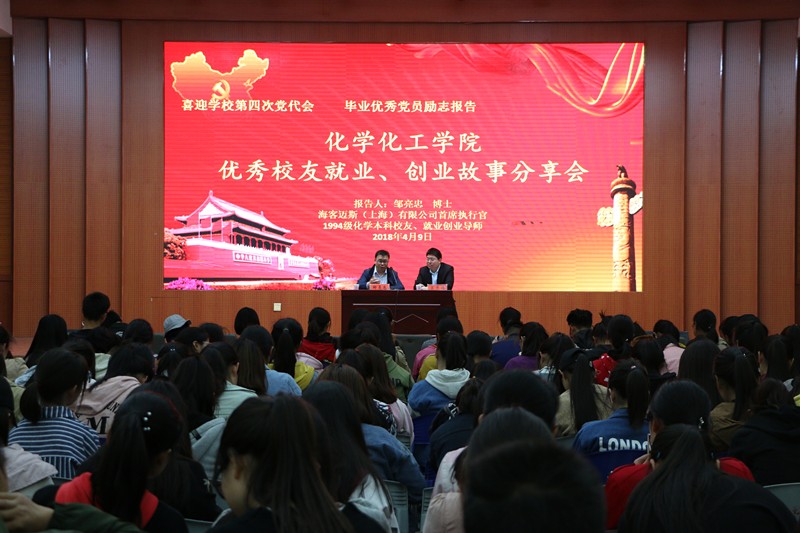 为喜迎学校第四次党代会,4月9日,永利集团304am登录在逸夫楼报告厅举办了优秀校友就业创业故事分享会。此次分享会邀请了海客迈斯(上海)生物科技有限公司首席执行官邹亮忠博士(94级化学校友、毕业优秀党员、永利集团304am登录现任就业创业导师)为大家做励志报告。学院党委书记郭鹏与400余名化院学子参加了此次报告,报告由永利集团304am登录党委副书记吴志伟主持。