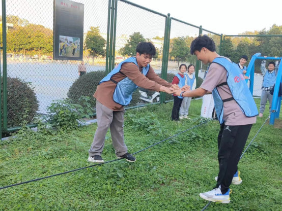项目二:信任背摔。在这一游戏中,需要把参与者把自己的后背交给自己的同伴,同学们紧张又期待想尝试此项目,最终非常信任地将后背交给下面的同学们。这一项目教会同学们学会在生活中养成换位思考的能力,我为人人,人人为我。