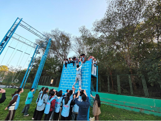 项目四:翻越胜利墙。这个游戏需要大家团队协作,共上高台,在同学们彼此的帮助与鼓励下,翻越了高墙,找到了属于自己的胜利。