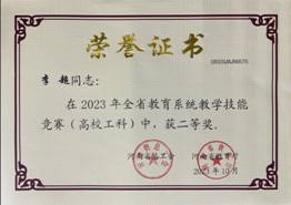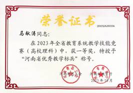 近日,河南省总工会、河南省教育厅公布了河南省教育系统2023年度教学技能竞赛获奖名单(豫工文[2023] 107号),永利集团304am登录遴选的青年教师马献涛博士、李超博士分别获得理科组一等奖、工科组二等奖。其中,马献涛博士顺利晋级现场决赛,取得理科组第7名的好成绩,同时被授予“河南省优秀教学标兵”荣誉称号。