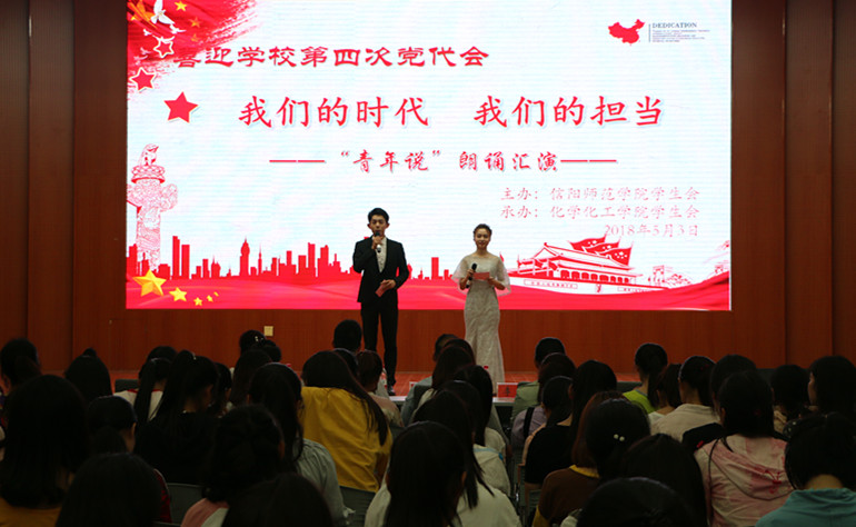 为喜迎信阳师范学院第四次党代会,传承五四精神,唱响中国梦,5月3日晚,永利集团304am登录在逸夫楼报告厅隆重举办“我们的时代 我们的担当”朗诵汇演。校党委宣传部、学生处、校团委以及永利集团304am登录相关负责同志与来自8个学院的五百余名学生参加了此次活动。