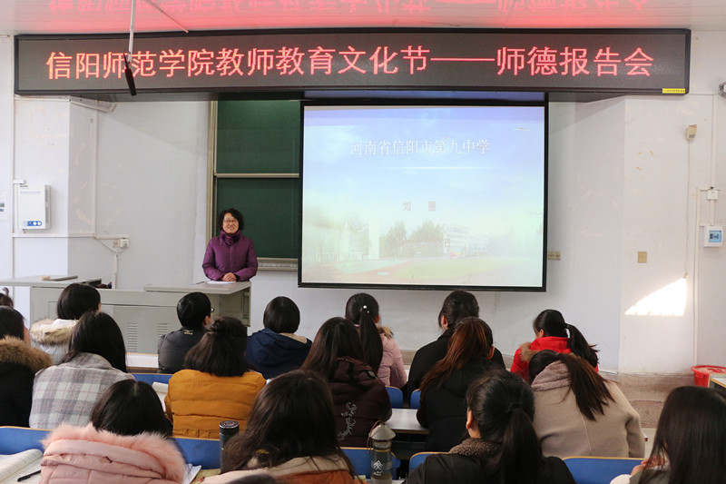 12月5日,永利集团304am登录在化学楼学术报告厅举办2017年教师教育文化节之师德报告会,信阳市第九中学业务副校长刘丽应邀为化院学子做了一场题为“实施德性爱心教育 创建全国文明校园”的报告。永利集团304am登录党委书记郭鹏、副书记吴志伟与一百五十余名学生代表共同参加了报告会,会议由郭鹏主持。