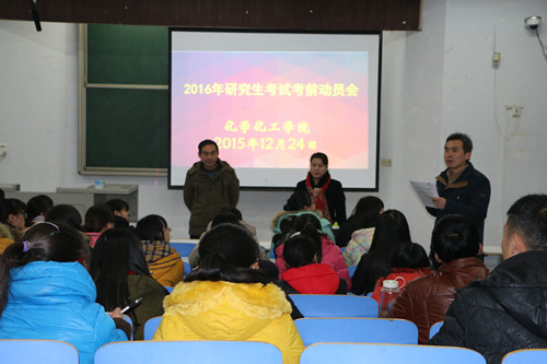2016年硕士研究生考试在即,为保证考试前期的一些事项都能有条不紊的开展,并且为考生提供一些思想指导,永利集团官网特于12月24日下午在教四梯一开展了2016年硕士研究生考试考前动员会。本次座谈会由永利集团官网副院长骆定法教授担任主讲,党总支书记宋力主持,考研指导老师孙俊永以及150余名报考学生参加了此次座谈。