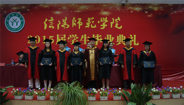 典礼在雄壮的国歌声中拉开帷幕。骆定法宣读了信阳师范学院《关于授予2015届毕业生学士学位的决定》,并公布获得学士学位学生的名单。随后,院长杨性坤作毕业致辞。他首先代表化院全体师生向毕业生表示衷心的祝贺,接着,对2015届毕业生提出了正视挫折、志存高远、无论身在何方都心系母校三点希望。在学生代表发言阶段,毕业生代表朱锦锦上台讲话,她回顾了大学四年的难忘时光,向化院的老师们表示了衷心的感谢,并承诺将铭记母校的教诲,奋勇向前,再上人生新台阶。在校学生代表刘方可用真挚的语言为即将离校的毕业生们送上最真挚的祝福,并表示将追随师兄师姐的脚步,奋发图强,继续为化院争光添彩。接着领导老师们为毕业生们颁发学位证书。大家在老师们面前恭敬地鞠躬,接受“拨穂礼”,轻轻一拨开启了一段段新的人生征程。毕业生们将秉承“厚德崇实,善学敏行”的校训,在社会的风浪中勇敢前行,时刻感念恩师的谆谆教诲与殷切鼓励。最后,2015届毕业生毕业典礼暨学士学位授予仪式在激昂慷慨的校歌声中落下了帷幕。