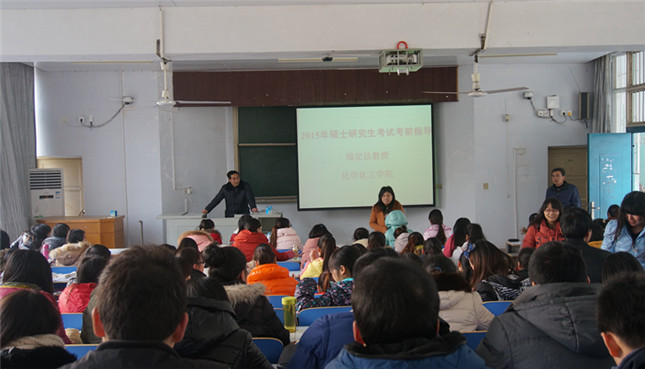2015年硕士研究生考试在即,为保证考试前期的一些事项都能有条不紊的开展,并且为考生提供一些思想指导,永利集团官网特于12月23日下午三点在教四梯一开展了2015年硕士研究生考试考前座谈会。本次座谈会由永利集团官网副院长骆定法教授担任主讲,党总支书记宋力主持,考研指导老师孙俊永以及150余名报考学生参加了此次座谈。