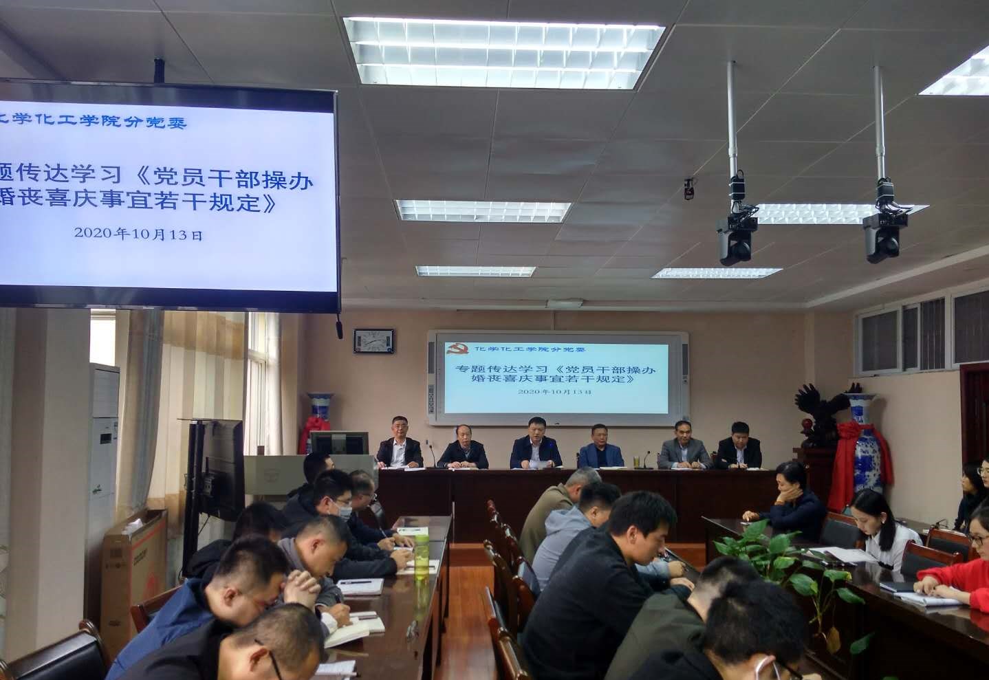 为认真贯彻落实中央八项规定精神,切实加强党员、干部、公职人员纪律约束,10月13日,永利集团304am登录分党委在实验楼407报告厅召开全体教职工大会,集体学习《党员干部操办婚丧喜庆事宜若干规定(修订)》的通知文件。永利集团304am登录全体教师集体参加学习。学习会由党委书记郭鹏主持。分党委纪检委员刘鹏针对文件精神进行宣讲、领学和解读。