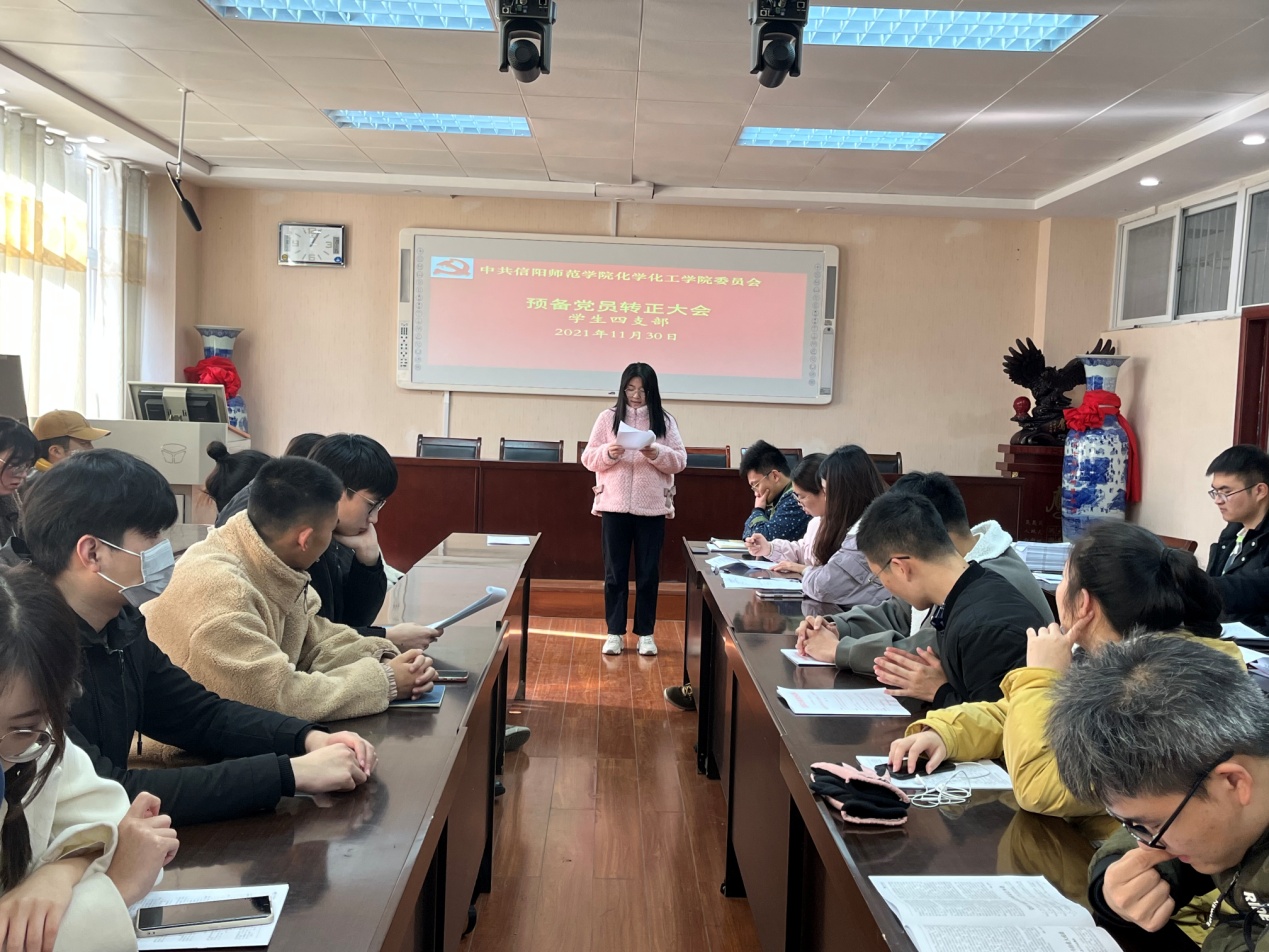 为巩固党员队伍质量,严格履行党章规定的预备党员转正手续,2021年11月30日,永利集团304am登录学生第四支部在实验楼407室召开预备党员转正大会,学生第四支部7名正式党员和14名预备党员参加本次大会,其中有5名预备党员转为正式党员。