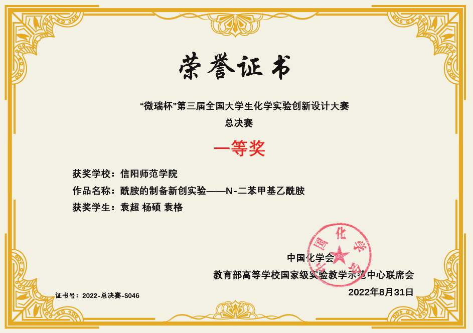 8月21-24日,由中国化学会和教育部高等学校国家级实验教学示范中心联席会主办的“微瑞杯”第三届全国大学生化学实验创新设计大赛总决赛在厦门大学举办。我校永利集团304am登录化学专业学生袁超、杨硕、袁格组成的参赛团队在马献涛博士、曹俊涛博士指导下,精彩展演,沉着应答,表现出色,最终获得全国一等奖。