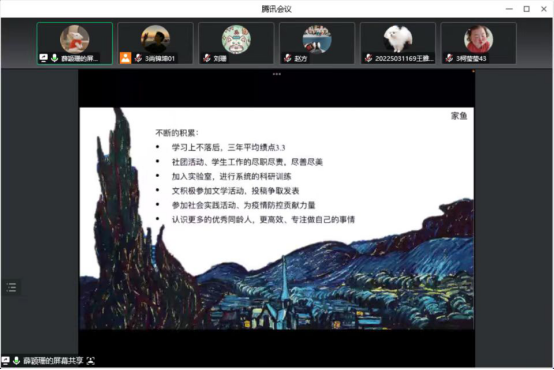 文学院2020级国家奖学金获得者刘珊同学,分享自己在思想、学习、生活、工作上的经历,奋斗历程和收获感悟,并激励同学们大学期间要坚守初心、脚踏实地、全力以赴,终将聚以成光;教育科学学院2020级自强之星获得者张豪鹏同学,通过自己在学习专业课中,要立志成为一名有情怀的学前教育人的经历,鼓励同学们怀着心中热爱,不断前进,成为更好的自己;物电电子工程学院2019级校园明星获得者薛颖珊同学,通过讲述自身大学经历,鼓励同学们做好学习规划,勇于开拓,厚积而薄发,努力成为更加优秀的自己。